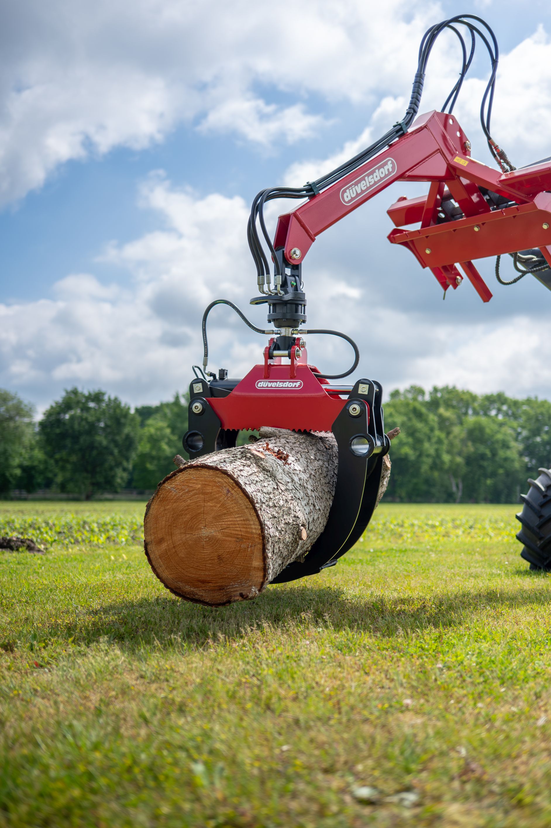 Zur Bedienung werden zwei doppelt wirkende Steuergeräte benötigt. Das funktionale Schild ist mit Kettenschlitzen ausgestattet und bietet die Möglichkeit zum Stapeln und Zusammenschieben von Stämmen.